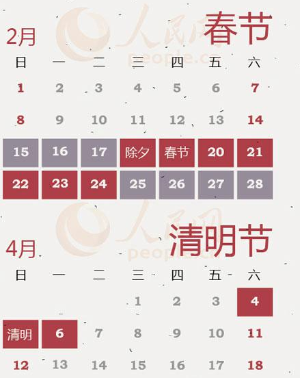 二、春节:2月18日至24日放假调休,共7天。2月15日(星期日)、2月28日(星期六)上班。
