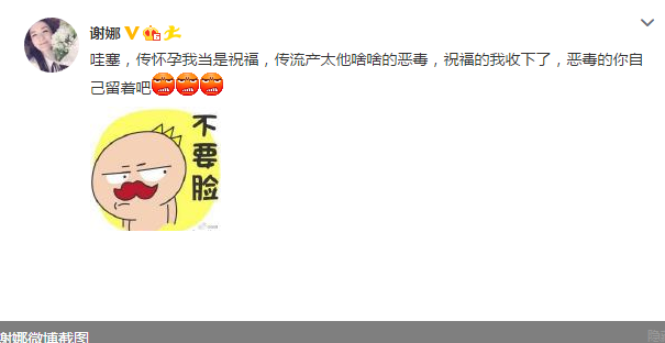 谢娜发文称:“哇塞,传怀孕我当是祝福,传流产太他啥啥的恶毒,祝福的我收下了,恶毒的你自己留着吧。”并配了一张“不要脸”的图片。