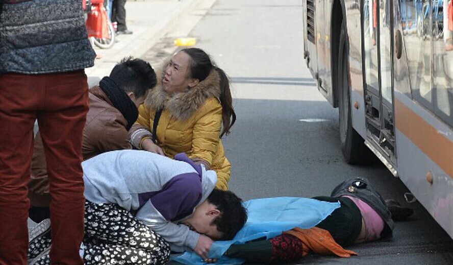 记者在现场目击到,死者为两名中年妇女。其中一人倒在公交站处,现场留下大摊血迹。多名目击者向记者证实,另一名死者被71路公交车拖带至10多米处才停下来。10点50分,后一名死者的家属已经到达现场。图为事发现场。